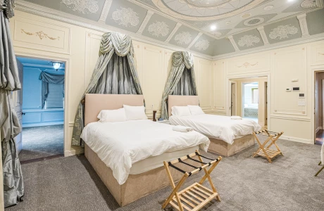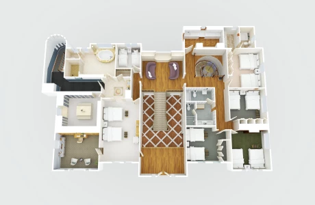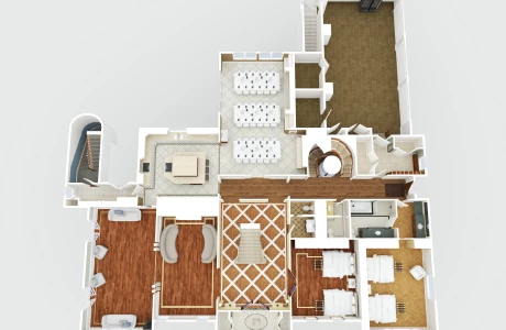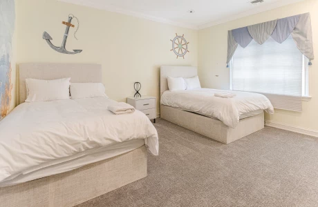 Upstairs: The second floor offers 4 well-appointed bedrooms, two of which feature king-sized beds, perfect for couples. The other two rooms each have two twin beds, providing ample space for guests. This floor also includes two full bathrooms, one of which is en-suite to the master bedroom, offering privacy and comfort.