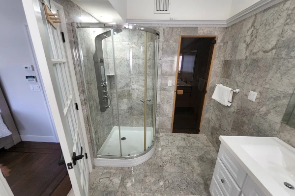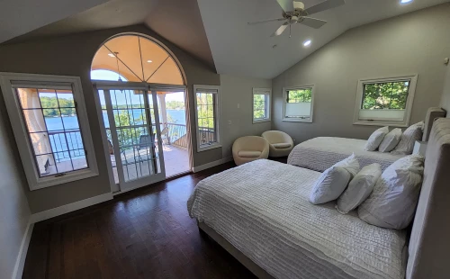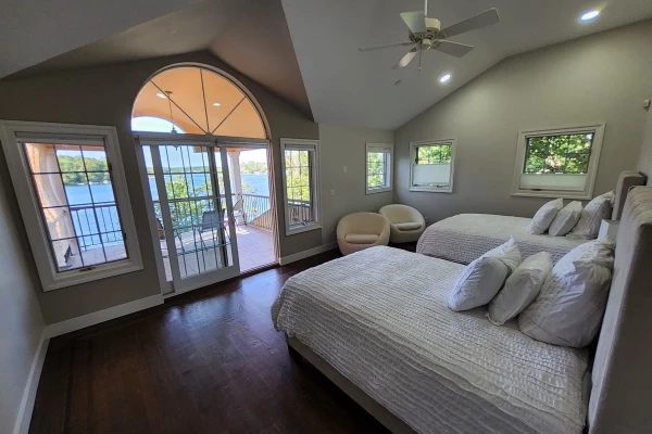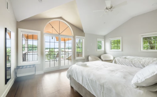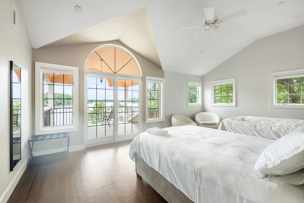Indulge in a peaceful night's sleep in this vast bedroom, with brand new, plush, high-end full size beds. Windows aligning the room give you the opportunity to watch sunrise from the comfort of your bed. Architectural patio door opend to a large deck overseeing a wide unbroken waterfront panorama. A luxurious bathroom with sauna and jacuzzi, equipped with luxurious towels and toiletries.
