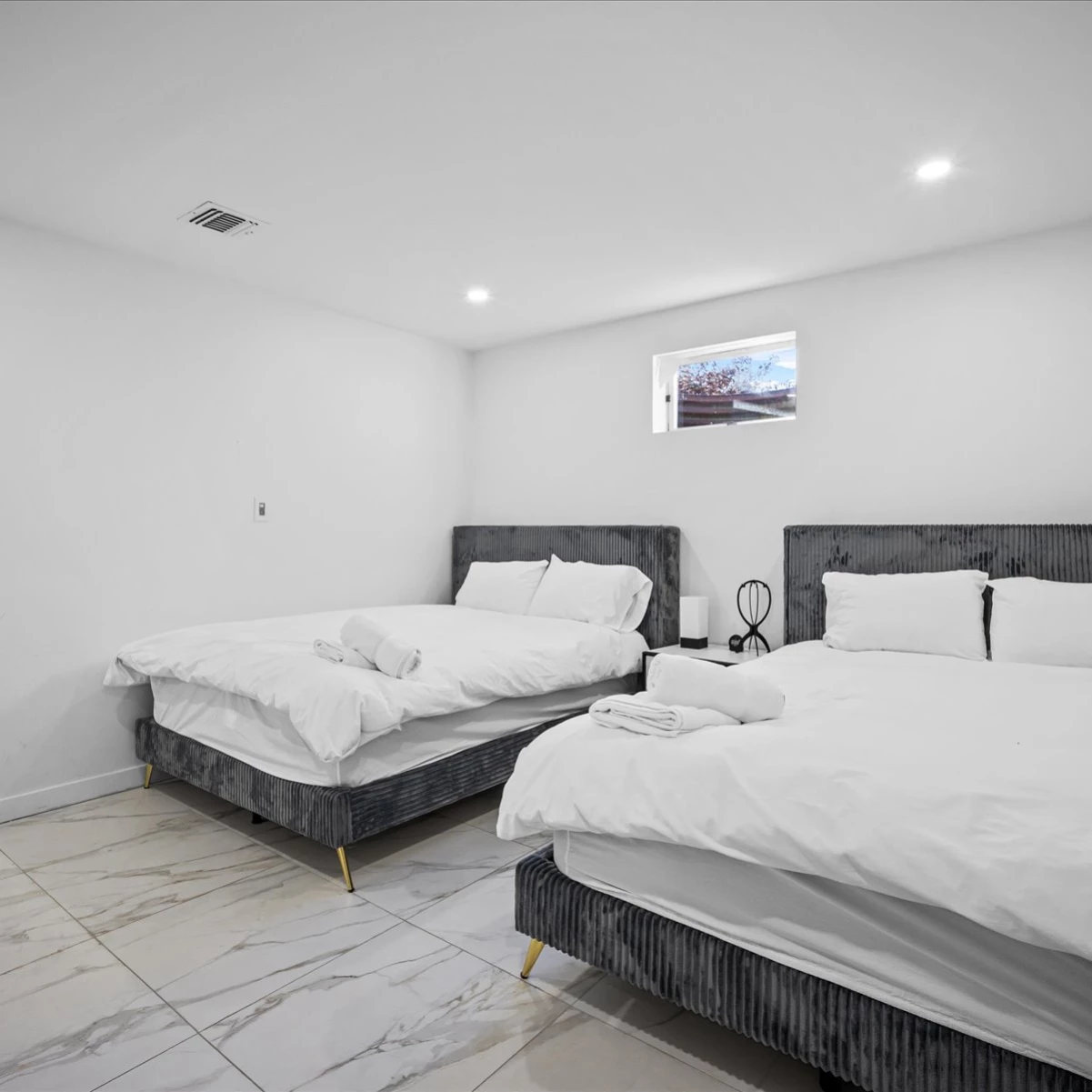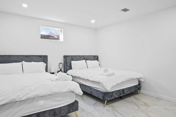 - Bedroom 2: Two full beds with an en-suite bathroom with a shower.