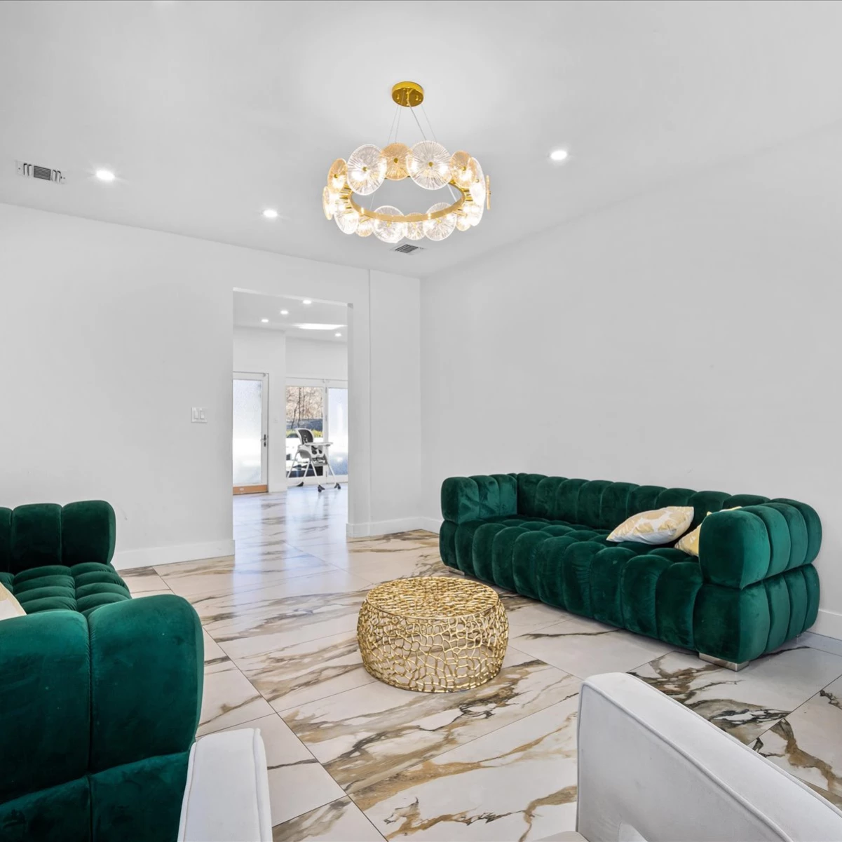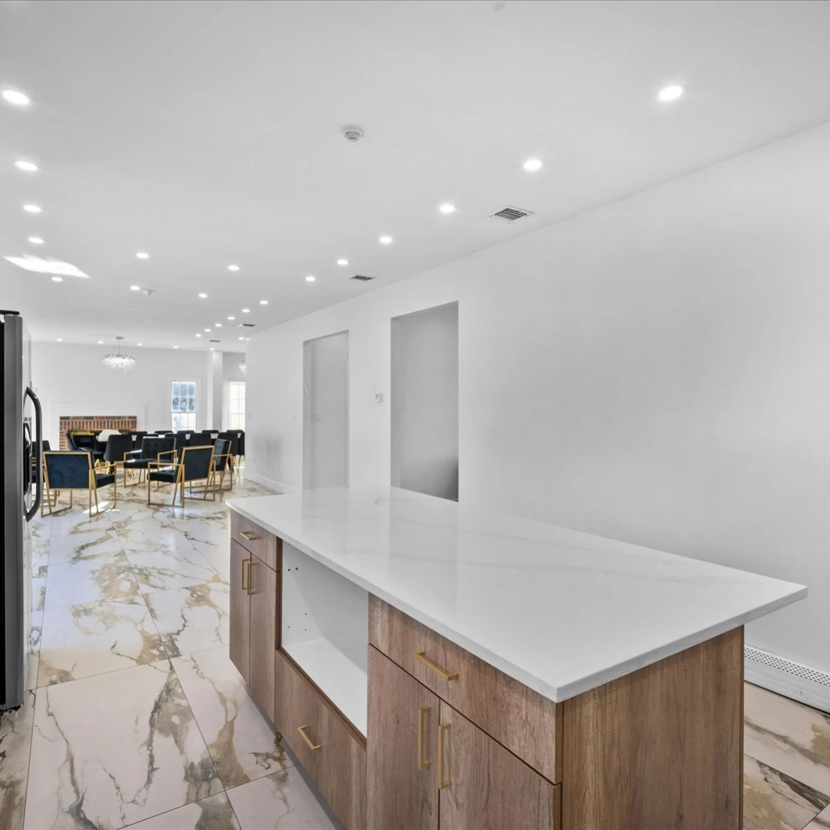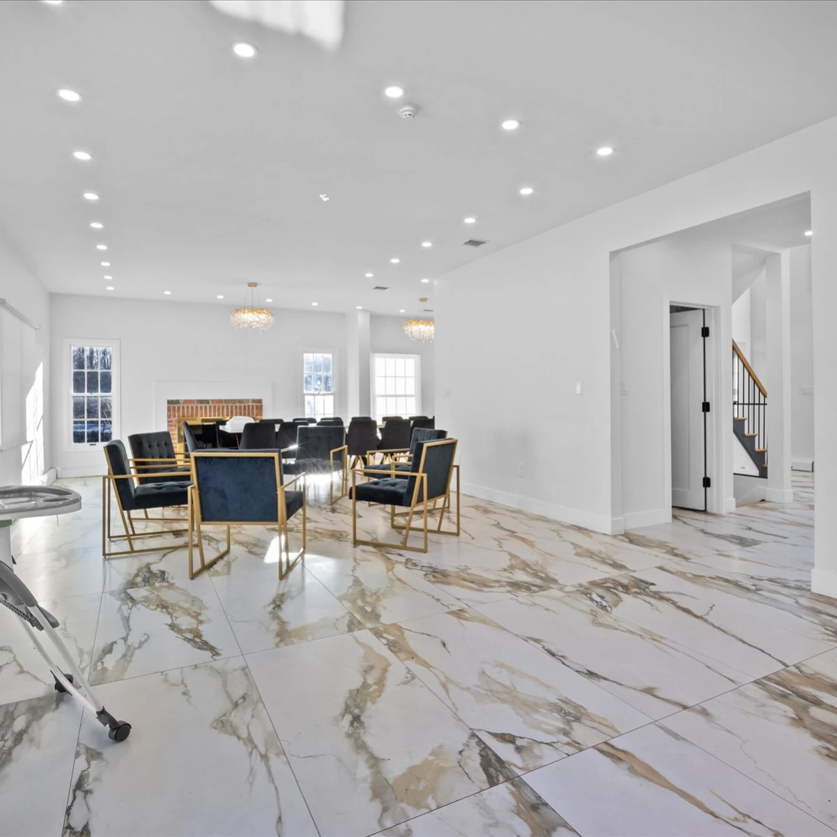 First Floor: Features a large living room, a spacious dining area, and a gorgeous kosher kitchen equipped with everything you need for light refreshments and meal preparation. In addition to the fridge and freezer in the kitchen, two extra fridge-freezer units are located in the garage for added storage.