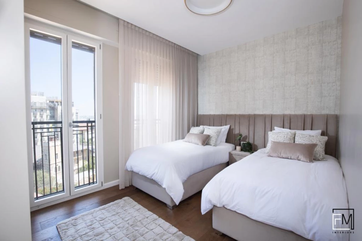 This beautiful, modern, brand new 3-Bedroom Apartment has 2 Bathrooms, plus another guest toilet. The master bedroom has wide beds and is en-suite. It has a beautiful fully equipped kitchen and dining room (semi combined) and one balcony. The Apartment is situated on the 7th floor and has stunning views of Yerushalaim.