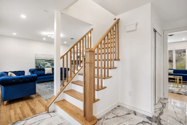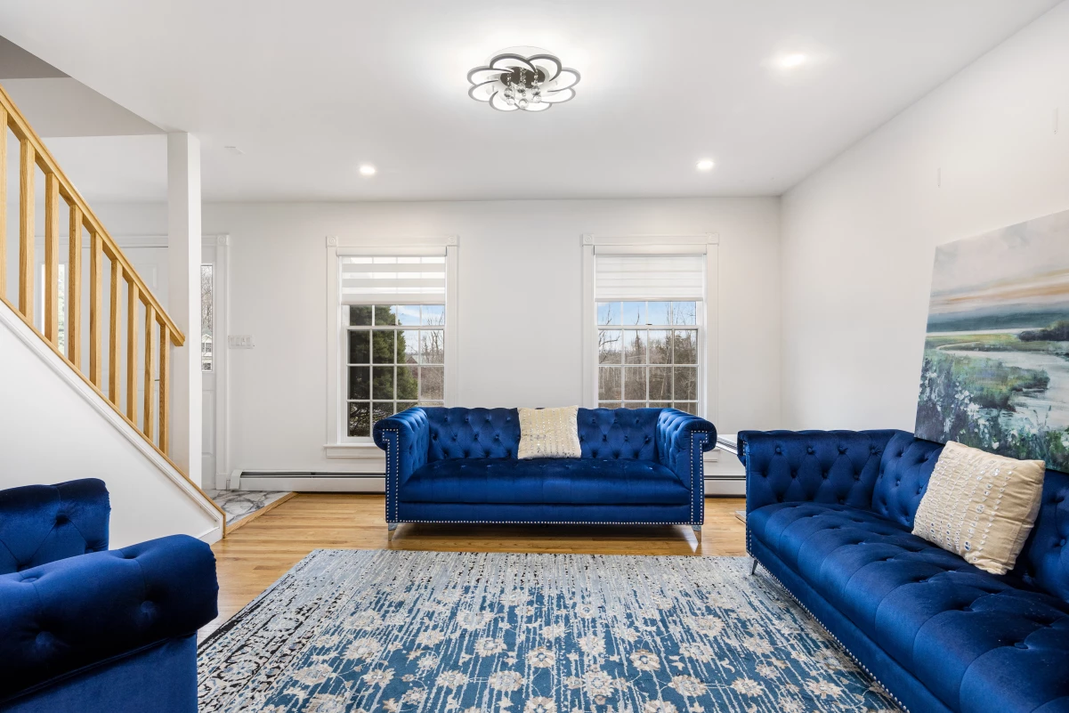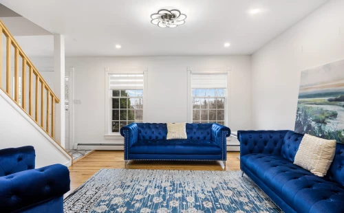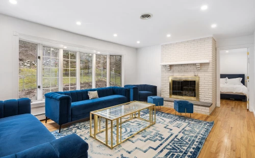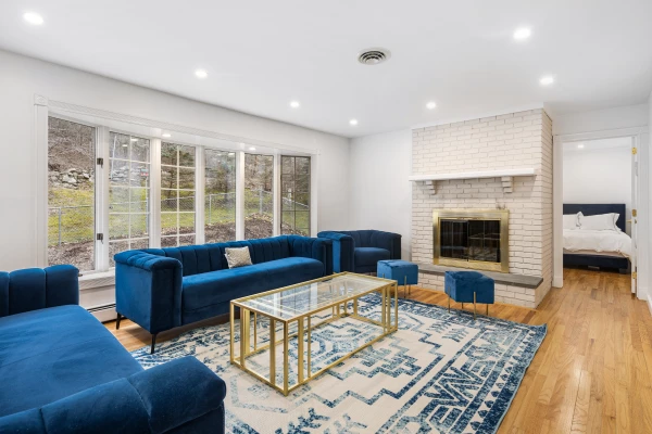 - Elegant Interiors: A spacious living room with a cozy fireplace and a bay window overlooking serene woods. A separate parlor offers a luxurious, quiet spot for reading and socializing.