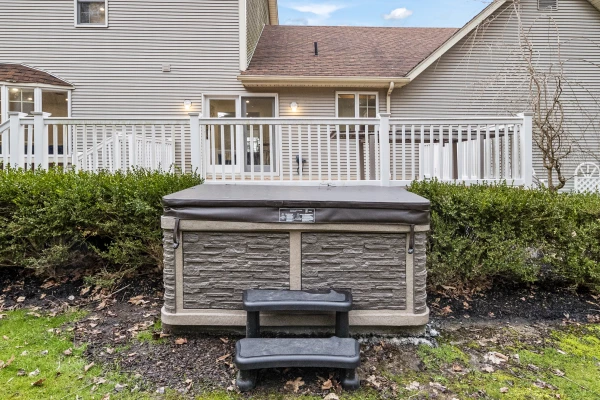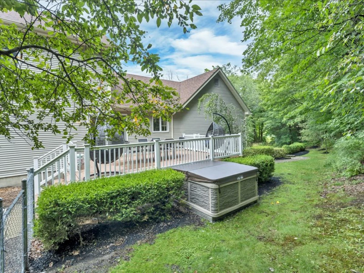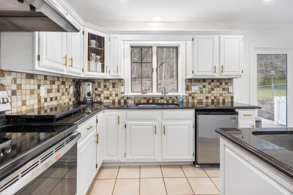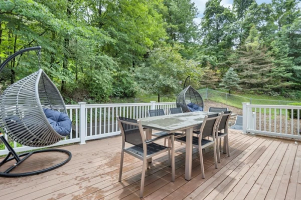 - Fully Equipped Kosher Kitchen: Modern and freshly painted, with granite countertops, a large island, and an adjacent deck with patio dining and nest chairs.