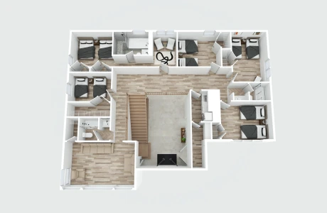 - Bedrooms 3, 4, and 5 (Upper Level): Each thoughtfully outfitted with two cozy twin beds, offering a private and tranquil space for children or additional guests.