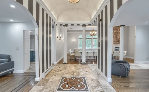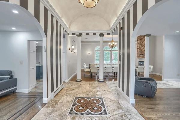 The property features a majestic circular driveway leading to an impressive entrance. Inside, a mosaic-tiled, spacious foyer is adorned with majestic pillars, glass-accented coffee tables, plush leather club chairs, and reclining sofas. Beyond is a sprawling dining area with seating for 40 [1] guests and three spacious bedrooms with ensuite bathrooms.