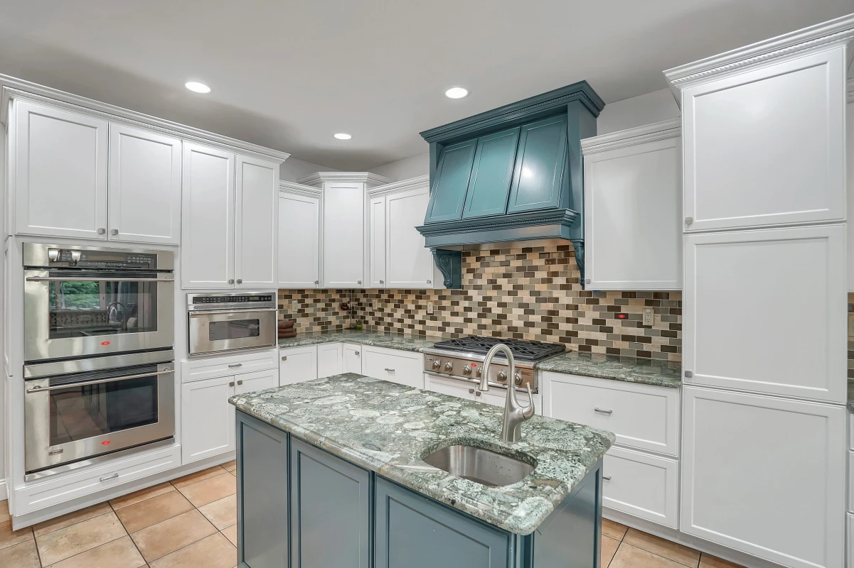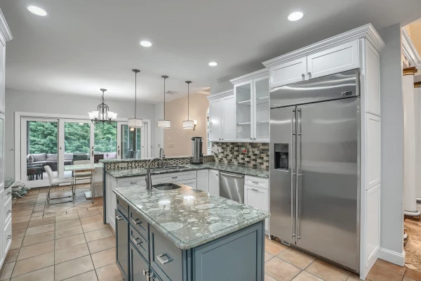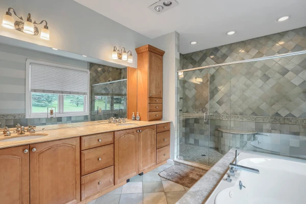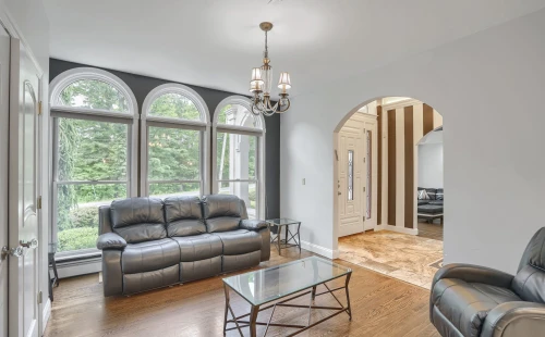 The heart of this magnificent home is the large kosher kitchen, where green and white hardwood cabinetry meets modern stainless steel appliances, including a six-burner gas top, two ovens, crock pots, and more. Glass walls open to a screened-in porch and a expansive deck with BBQ facilities, ideal for outdoor dining or to enjoy the breathtaking mountain views.