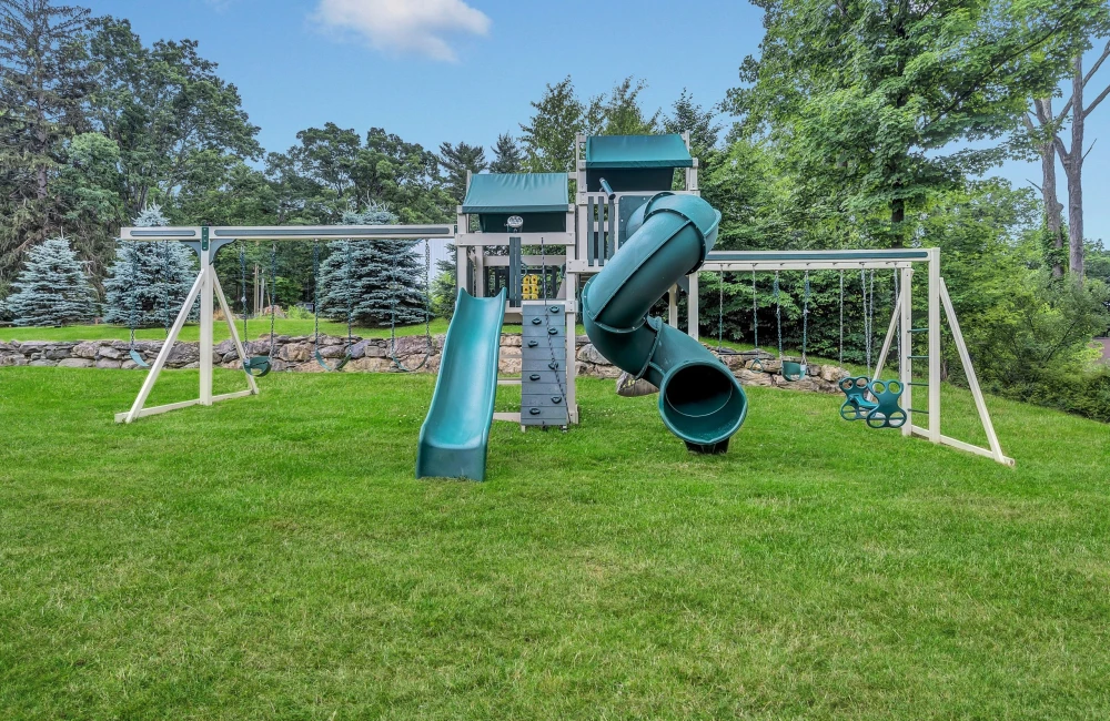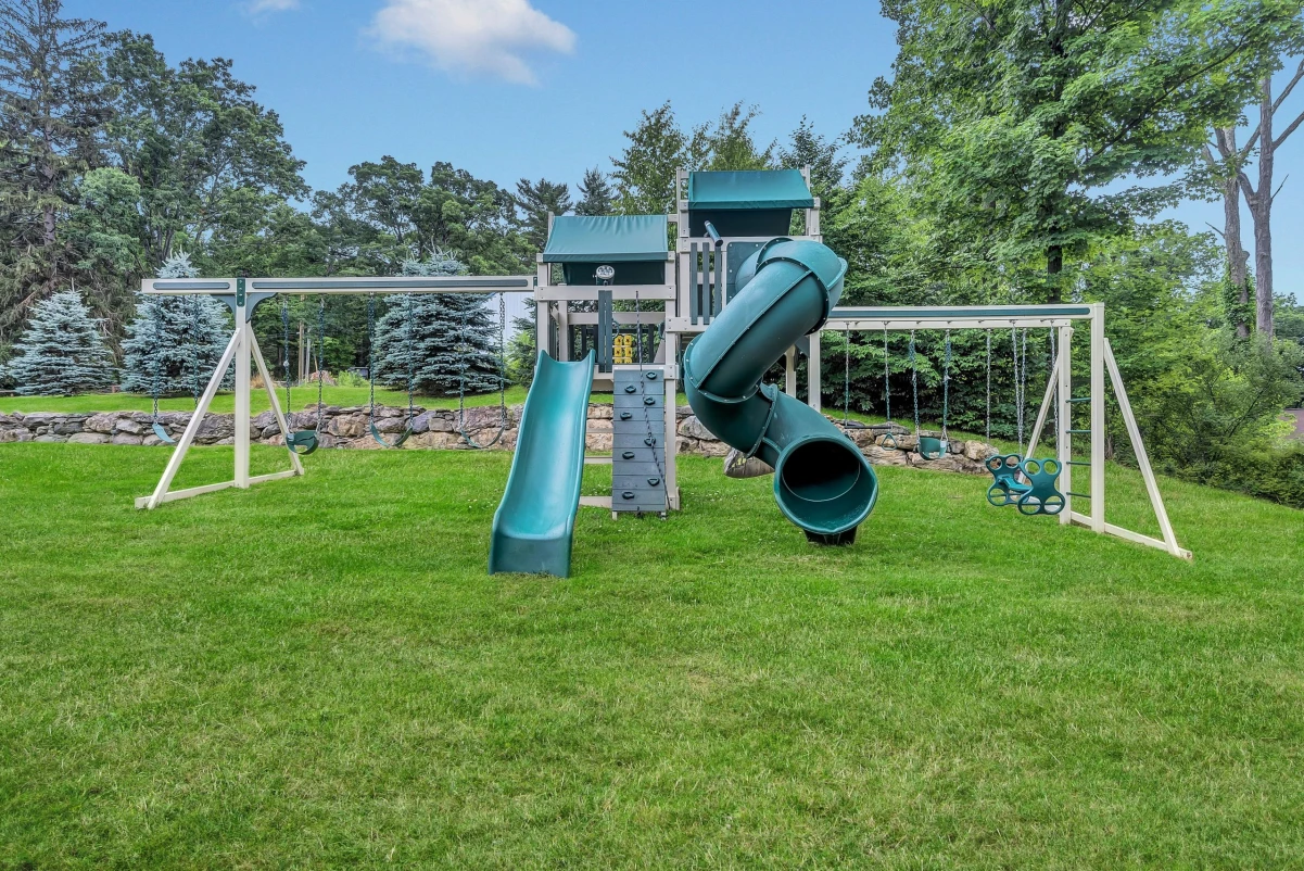 The outdoor space features sprawling lawns, a patio with a wood-burning fire pit, an extensive swingset, and a basketball court. For larger gatherings and celebrations, the loft above the garage offers additional sleeping quarters, a kitchenette, and more.