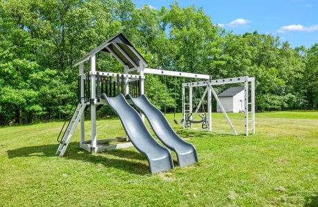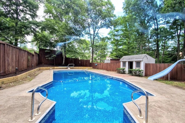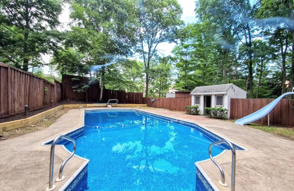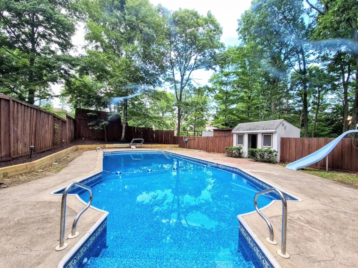 Outdoor Amenities: The backyard features a summer-only pool and a trampoline, perfect for family fun.